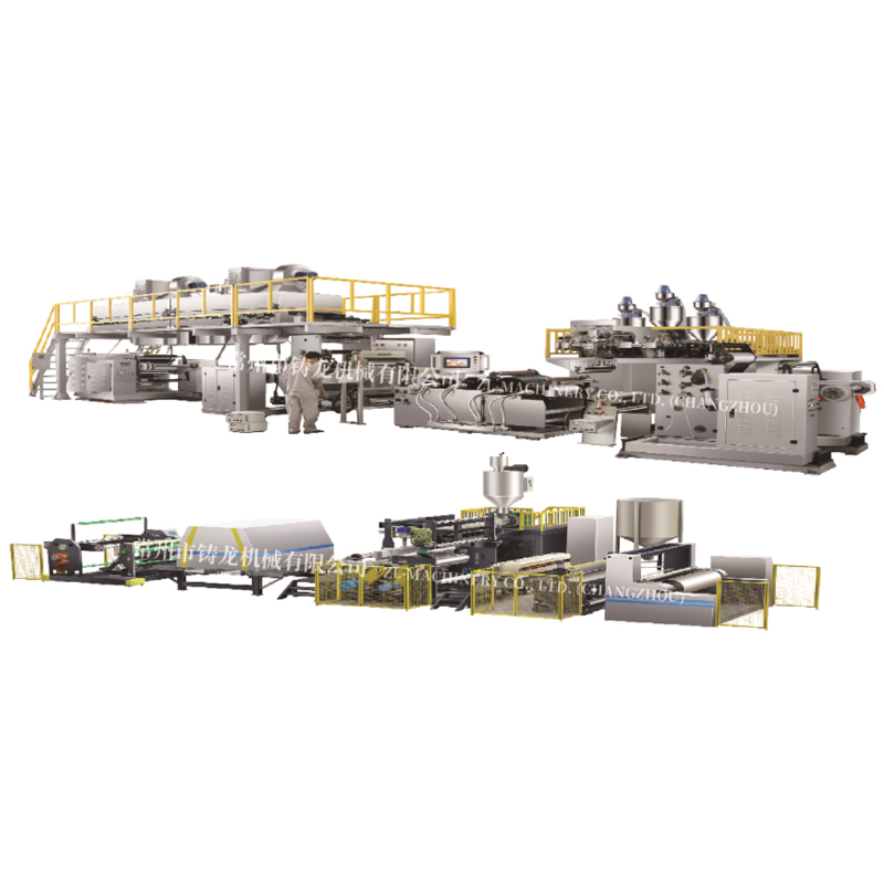 鑄龍ZLX-LM擠出淋膜復合機組系列,利用PE/EVA/PP/TPU/POE等熱塑材料的擠出工藝,對基材進行單/雙面覆膜或多層復合,形成具有多種功能的復合制品。該系列設(shè)備擁有多種模塊化結(jié)構(gòu),通過模塊組合,可以實現(xiàn)低速、中速、高速、超薄、超高克重淋膜復合功能,適用淋膜基材涵蓋薄膜、無紡布、珍珠棉、發(fā)泡卷材、紙、紡織品、編織布、針刺布、水刺布、網(wǎng)格布、功能隔膜、金屬箔、鍍鋁膜等。通過單機、雙機、多機以及單層/共擠、預熱、預涂、復合等功能選配,可以滿足食品、外包裝、裝飾品、建材、農(nóng)業(yè)、光電、車船航天功能材料等領(lǐng)域的廣泛需求。